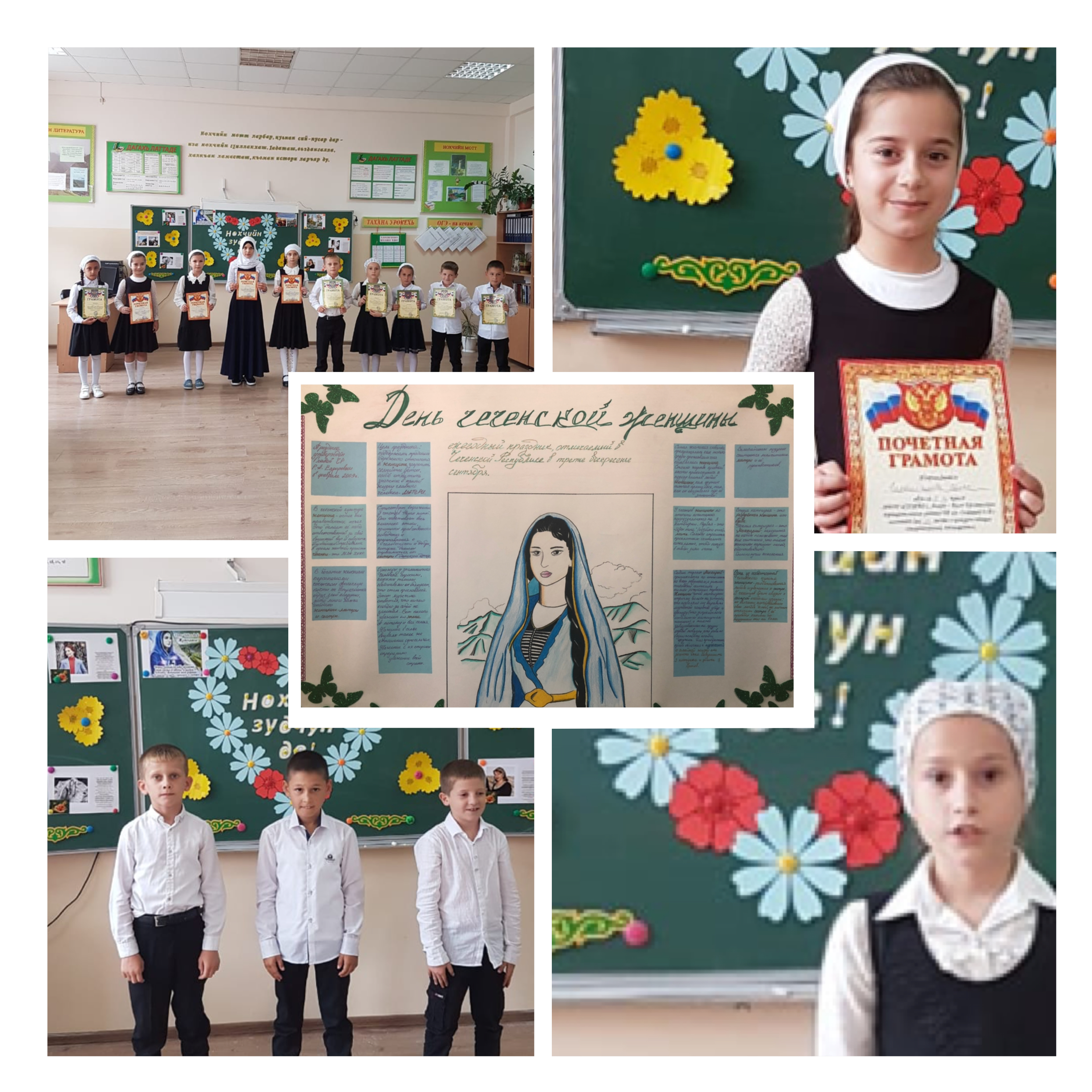 конкурс рисунков, сочинений и стихов посвященные Дню чеченской женщины.Неделя была очень насыщенная.11.09.2019 года руководителем МО чеченского языка и литература Джунаговой М.В. среди учащихся 1-5 классов проведен конкурс стихов. Праздничное настроение на конкурсе. В утопающем в цветах, шарах, детских рисунках кабинете чеченского языка рекой лились поздравительные речи в адрес учителей, матерей, сестер и одноклассниц. По-особенному внимательными и обходительными были в этот день представители сильной половины человечества – мальчики и юноши-учащиеся нашей школы. Свою лирическую композицию- художественное чтение поэмы известного чеченского поэта Умара Яричева «Чеченской женщине» юноши 5 а класса посвятили всем женщинам Чечни.