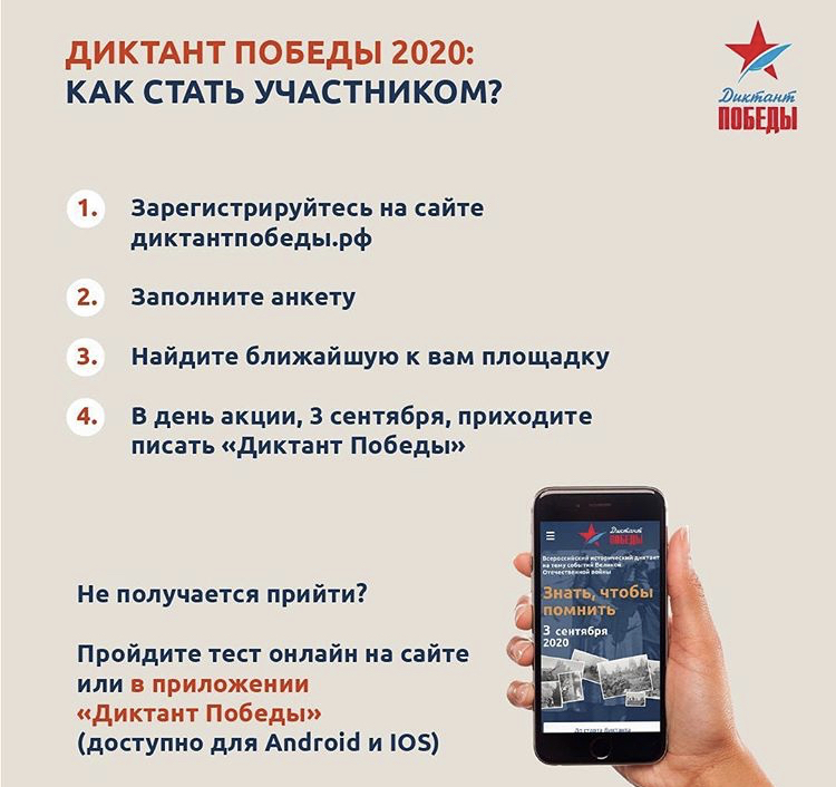 мира в память о героях, отстоявших мир на земле. Присоединяйтесь! Заходите на сайт акции диктантпобеды.рф и регистрируйтесь. Призываю всех принять участие во флешмобе "Я иду на Диктант Победы, приходи и ты!" Делайте публикации с призывом придти на Диктант Победы в своем городе/селе и ставьте # #ЗнатьЧтобыПомнить и #Помним2020