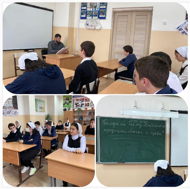28.01.202128. 01.2021 г. директором школы Солсаевым А. Х. была проведена беседа с учащимися 8 „а“ класса на тему «Вайнахские адаты, обычаи и традиции». В своей речи Адам Халидович отметил, что духовность чеченского народа берёт истоки из глубокой древности.