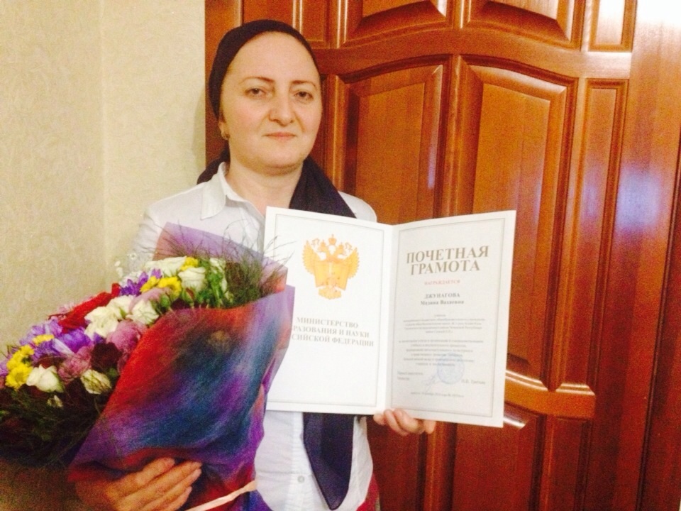 13.02.2015Мы поздравляем Джунагову Мадину Вахаевну учителя чеченского языка и литературы с присвоением ей почётного звания «Почётный работник общего образования Российской Федерации»!!!