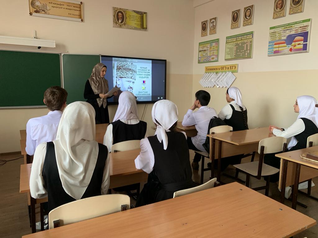 07.12.2023В МБОУ "СОШ № 3 с.Алхан-Кала им.Сатиной Е.П.",был проведен Урок мужества,посвященный Первому Президенту Чеченской Республики,Герою России