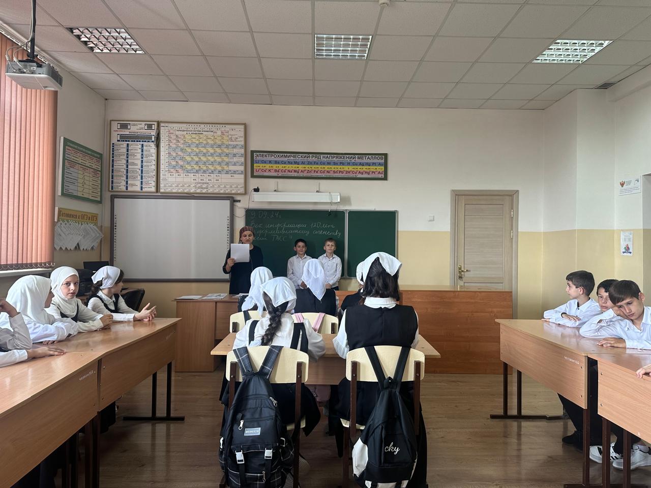 9 сентября в МБОУ "СОШ № 3 с.Алхан-Кала" прошли классные часы из курса внеурочной деятельности Разговоры о важном. Урок посвящен 120-летию Информационного агенства России ТАСС.