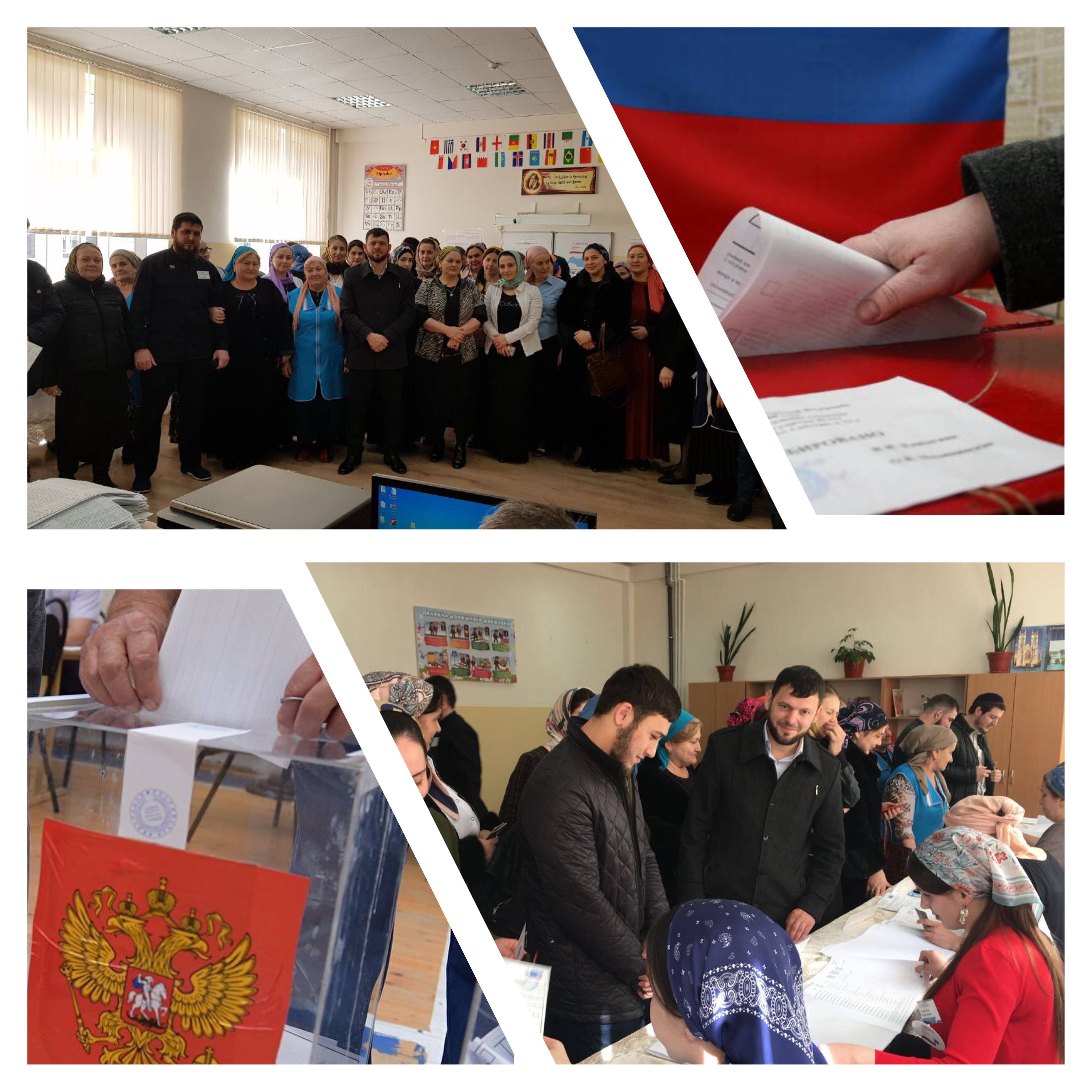 Сегодня коллектив МБОУ ""СОШ 3 с. Алхан-Кала " пришёл на 92 избирательный участок,чтобы отдать свои голоса при выборе Президента России.