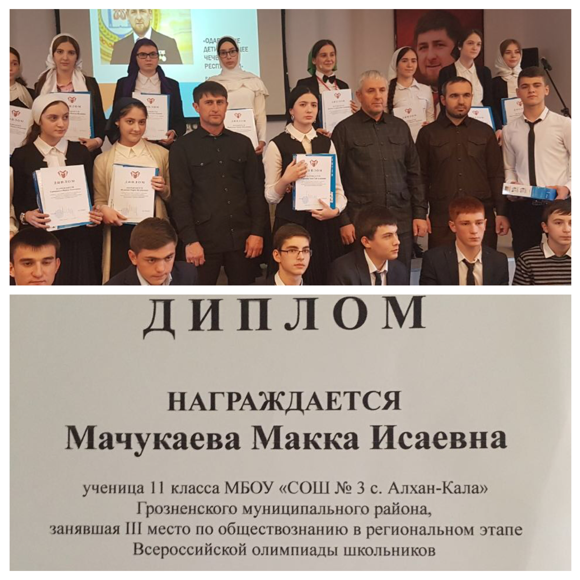 Ученица 11 класса МБОУ «СОШ 3 с. Алхан-Кала Мачукаева Макка заняла третье место по обществознанию в региональном этапе Всероссийской олимпиады школьников. Поздравляем!!!