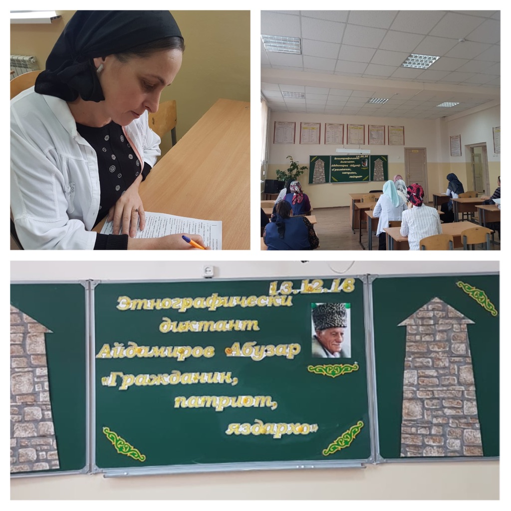 классика чеченской литературы, выдающегося общественного и политического деятеля Абузара Абдулхакимовича Айдамирова. В нем приняли участие заместитель Председателя Правительства ЧР Шахид Ахмадов, министр образования и науки ЧР Исмаил Байханов. В ходе диктанта участники акции ответили на 85 тестовых заданий о жизни и творчестве чеченского литератора, внесшего неоценимый вклад в патриотическое и духовно-нравственное воспитание чеченской молодежи. По словам организаторов, акция была проведена по поручению Главы ЧР, Героя России Рамзана Кадырова для повышения уровня этнокультурной и лингвистической компетентности граждан Чеченской Республики на основе творчества Абузара Айдамирова, пропаганды и укрепления духовных ценностей через богатство родного языка и литературы. Необходимо отметить, что акция прошла одновременно во всех образовательных организациях, в ней приняли участие главы министерств и ведомств республики, главы администраций муниципальных районов, представители научной и творческой интеллигенции, а также учащиеся и их родителей.